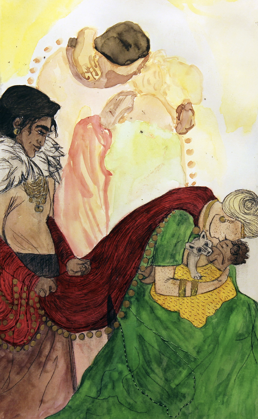 I created MASTER OF TWO WORLDS over the course of Fall 2015 into Spring 2016. It’s a 24 page, mixed media fantasy epic. The lines for each page were created using intaglio printmaking and it was colored with a combination of watercolor and acrylics. More printmaking and collage is incorporated into the piece, as well as stitching and even some shoe polish. I lettered it in Photoshop.